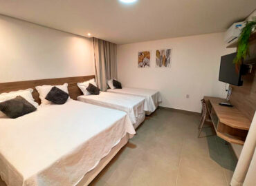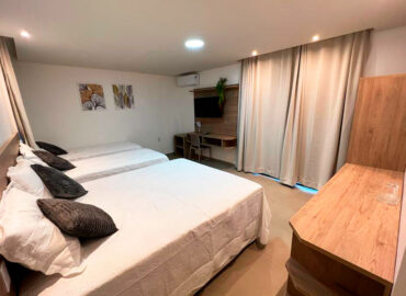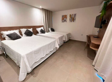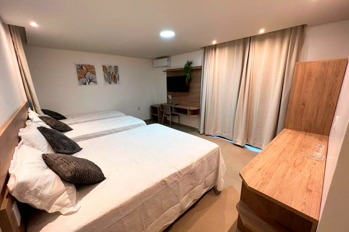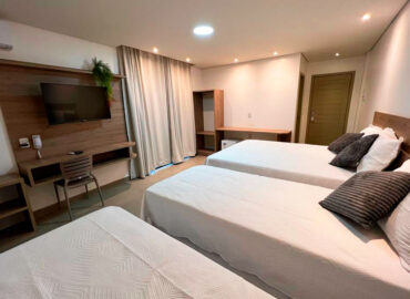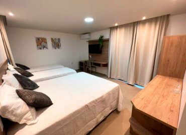 O Quarto Familiar dispõe de uma cama de casal e duas de solteiro, distribuídas de maneira a proporcionar um ambiente espaçoso e bem organizado. As camas de casal, amplas e confortáveis, garantem uma noite de sono reparador para casais ou indivíduos que preferem um espaço maior. As camas de solteiro, por sua vez, são ideais para crianças ou hóspedes adicionais, oferecendo a mesma qualidade e conforto.